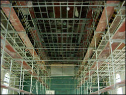 Hier wurde die Decke einer Turnhalle eingerüstet, damit Dachdeckerarbeiten von innen durchgeführt werden konnten.