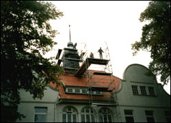 Der Standard-Gerüstaufbau an einem Einfamilienhaus. | Einrüstung eines Glockenturmes, wobei das Gewicht des Gerüstes gleichmäßig über Aufleger auf das Dach verteilt wurde. | Einrüstung einer Wohnanlage bis 25 m Höhe. Für eine Einrüstung mit einer Höhe von mehr als 25 m muss eine Statik erstellt werden. | Einrüstung einer Kirche. |